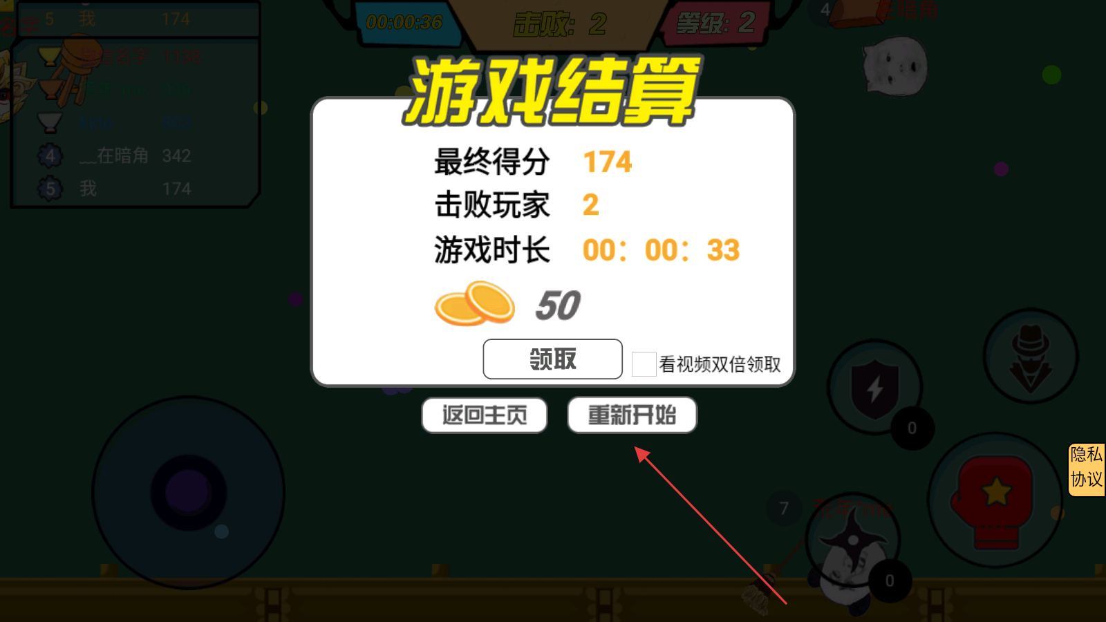 4、游戲結束后,會出現結算界面可以點擊重新開始按鈕再次進行游戲挑戰,也可以點擊領取按鈕,獲取本次游戲獲得的金幣等獎勵。