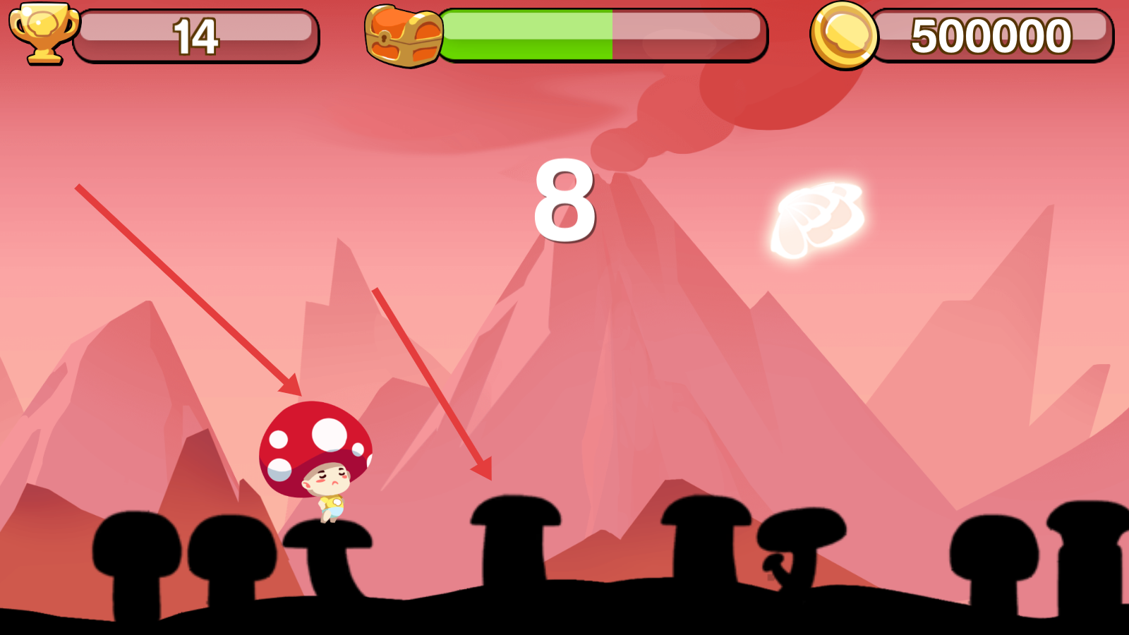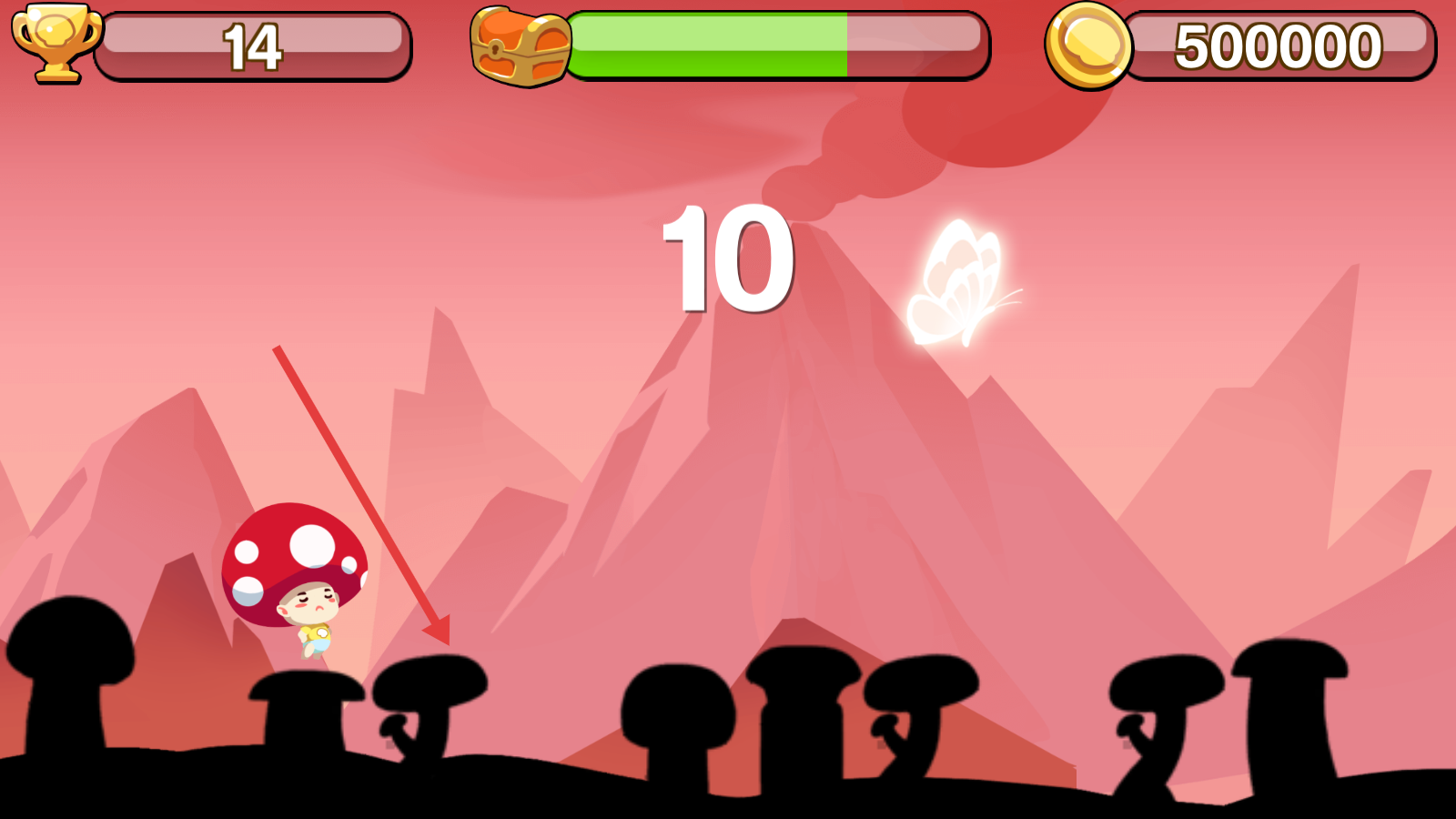 3、在跳躍過程中成功跳到蘑菇平臺等操作會獲得分數,同時還可能收集到蝴蝶等元素,獲取額外獎勵。