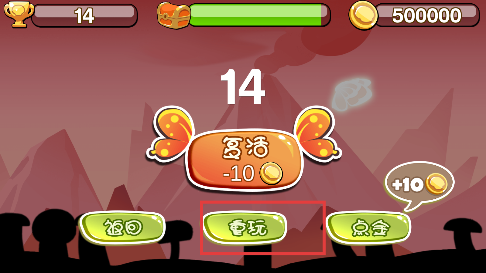 4、如果蘑菇角色掉落游戲失敗,可以選擇花費金幣點擊復活按鈕重新回到游戲繼續挑戰,也可以點擊重按鈕。