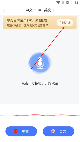 4、進入語音翻譯界面后,確認當前選擇的源語言和目標語言,非會員可試用3次,若需無限使用可點擊立即開通按鈕升級會員。