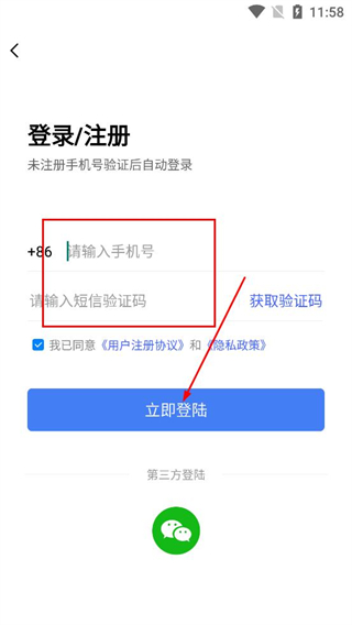 2、在對應輸入框填寫手機號,再點擊獲取驗證碼,輸入收到的驗證碼,勾選同意協議后點擊立即登錄。