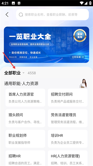 2、職業大全頁,呈現4558類職業,以人力資源類為例,展示首席人力資源官等崗位,提供職業分析指南。