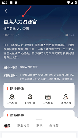 3、首席人力資源官詳情頁,說明其職責為人才戰略規劃等,含職業別稱相近職業,配備職業畫像等工具。