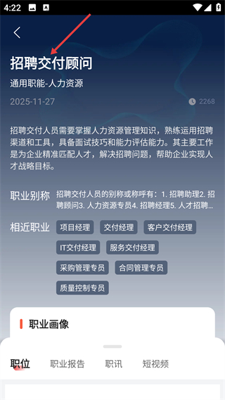 4、招聘交付顧問詳情頁,介紹其需掌握招聘工具與評估能力,說明別稱及相近職業,輔助了解崗位要求。