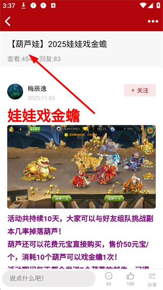 2、點擊游戲公告,可查看如2025娃娃戲金蟾等活動詳情,了解活動持續時間、參與方式及獎勵獲取途徑。
