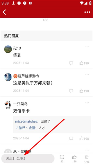 4、熱門回復板塊,可查看其他玩家的評論,也可在輸入框說點什么吧中發表自己的看法,參與互動討論。