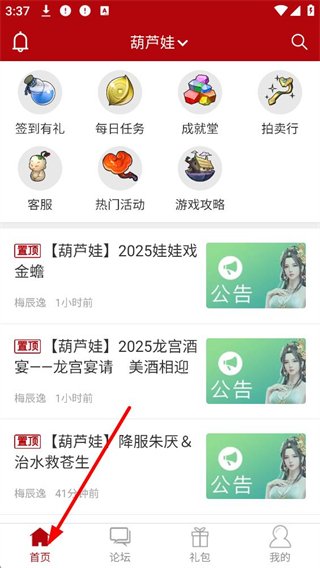 1、進入葫蘆娃游戲平臺首頁,有簽到有禮、每日任務等功能入口,還有游戲公告板塊,可參與活動和了解游戲最新動態。
