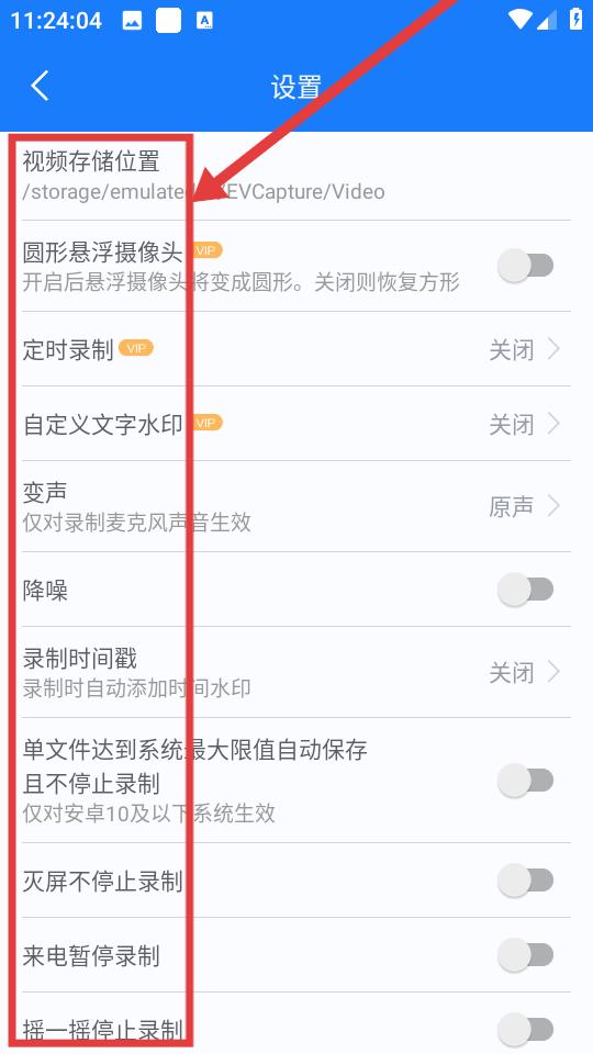 3、設置頁面頂部顯示視頻存儲位置路徑,下方排列圓形懸浮攝像頭定時錄制等VIP功能入口,還有變聲降噪及錄制時間戳等開關選項。