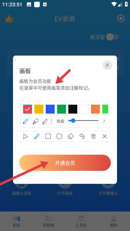 2、畫板功能說明彈窗為會員功能,錄屏時可用畫筆添加注解標記,界面展示紅黃綠等色彩選項、不同畫筆樣式及粗細調節滑塊。