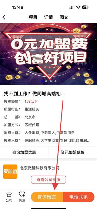 4、進入項目詳情頁查看投資額度所屬行業等信息,點擊咨詢留言或電話聯系按鈕,與項目方溝通加盟相關事宜。