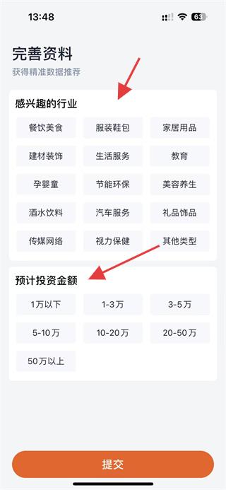2、進入完善資料頁面選擇感興趣的行業分類,選定預計投資金額范圍,確認信息后點擊提交按鈕,獲取精準的加盟推薦。