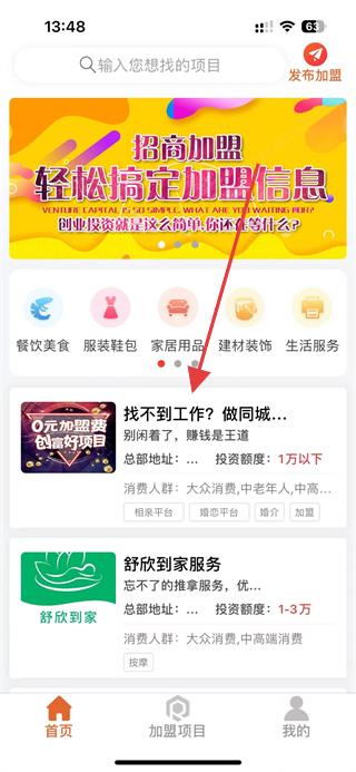 3、進入加盟項目頁面使用搜索框查找目標項目,瀏覽餐飲美食生活服務等分類,選擇感興趣的加盟項目進入詳情頁。
