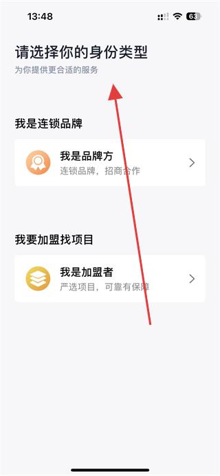 1、打開軟件進入身份選擇頁面,根據需求選擇我是品牌方或我是加盟者身份,品牌方可進行合作,加盟者可查找靠譜項目。
