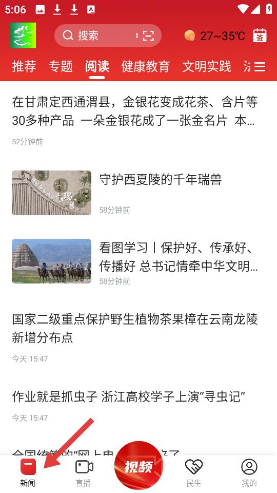 1、點首頁新聞板塊,上方有搜索欄與天氣,下方展示各類資訊,如甘肅金銀花產業、保護野生植物等消息。