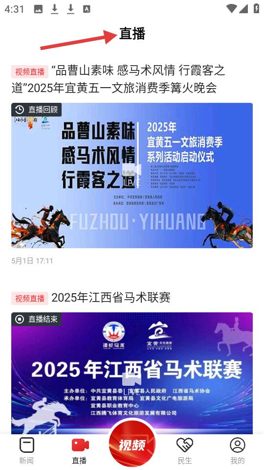 2、點直播頁面,呈現2025年宜黃五一文旅活動及江西省馬術聯賽等視頻直播與回顧內容。
