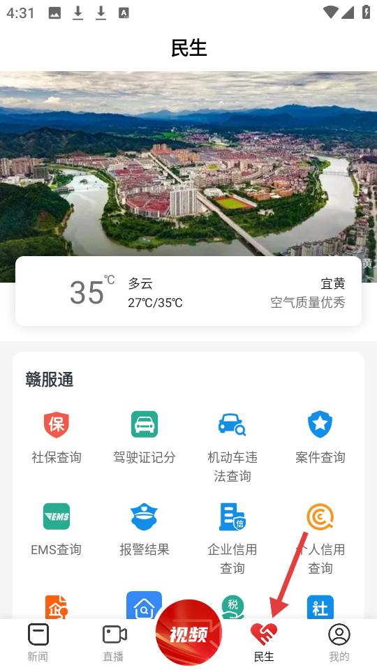 4、進入民生頁面,展示本地天氣及空氣質量信息,設贛服通服務入口,涵蓋社保查詢等多項便民功能,底部對應民生導航欄,獲取生活相關服務。