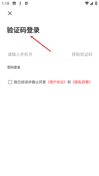 1、進入驗證碼登錄頁面,可選擇輸入手機號獲取驗證碼登錄,也能切換為密碼登錄,操作前需勾選同意用戶協議和隱私政策,完成對應操作后可進入應用。