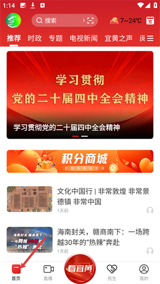 2、進入首頁,頂部設搜索欄與推薦時政等分類標簽,展示專題內容及本地資訊,配備積分商城入口,底部對應首頁導航欄,可瀏覽各類本地相關信息。