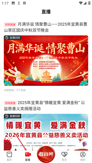 3、進入直播頁面,展示視頻直播的回顧內容,涵蓋雙節晚會、公益慈善活動等本地活動,標注活動的主辦與承辦方信息,底部對應直播導航欄,查看本地活動動態。