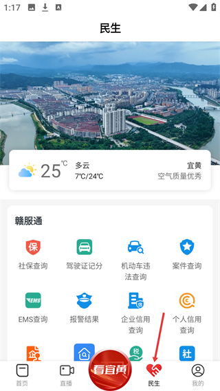 3、點民生界面,顯示宜黃天氣與空氣質量,提供社保、駕駛證記分等多種民生信息查詢功能。