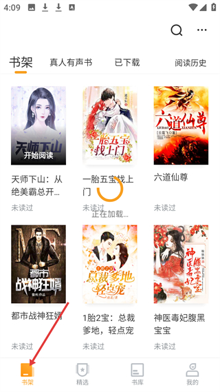 1、書架展示天師下山、一胎五寶找上門、六道仙尊、都市戰神狂婿等小說,方便用戶管理閱讀書籍。