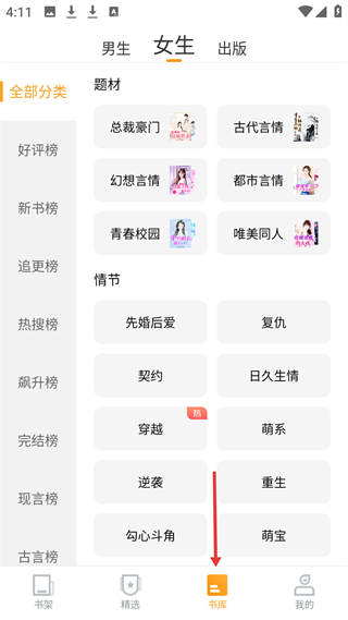 3、書庫女生板塊有總裁豪門、古代言情等題材,還有好評榜、新書榜等多個榜單,方便用戶篩選小說。