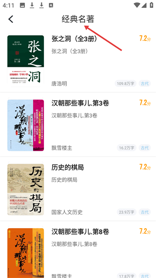 4、經典名著板塊展示張之洞全3冊、漢朝那些事兒、歷史的棋局等書籍,滿足用戶經典閱讀需求。
