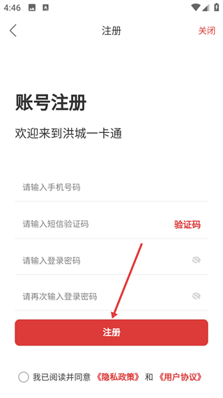 2、進入注冊界面需填寫手機號碼,獲取并輸入短信驗證碼,設置并確認登錄密碼,勾選相關協議后,點擊注冊按鈕完成賬號注冊。