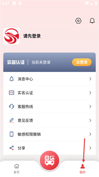 4、進入我的界面顯示請先登錄狀態,包含消息中心實名認證等功能,點擊去登錄跳轉至登錄界面,登錄后可管理個人相關服務。