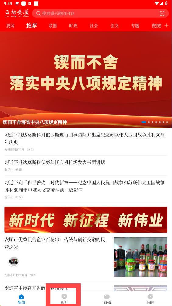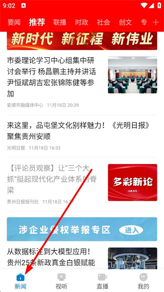 1、新聞界面可查看要聞、推薦、聯播等分類資訊,了解安順當地的時政、社會、創文等新聞,還有涉企業侵權舉報專區入口。