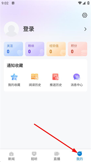 2、點擊我的進入個人中心,可進行登錄操作,查看關注、粉絲、經驗值、積分等信息,還有我的收藏、閱讀歷史等服務。