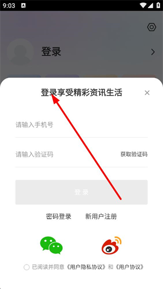 3、登錄時可輸入手機號和驗證碼,也可選擇密碼登錄或新用戶注冊,還能通過微信、微博等方式登錄,勾選同意協議后完成登錄。