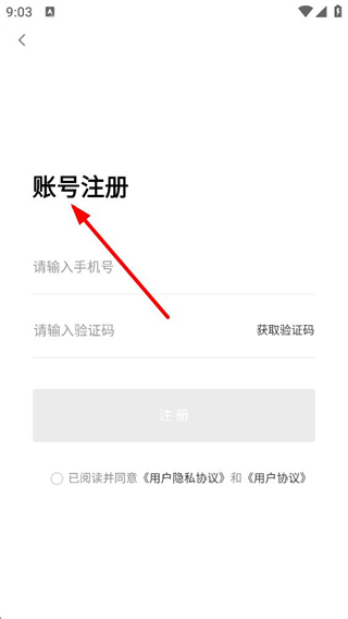 4、賬號注冊時輸入手機號和驗證碼,勾選同意用戶隱私協議和用戶協議后點擊注冊,完成賬號注冊流程。