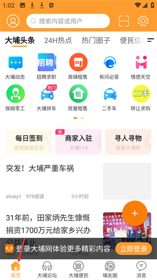 1、首頁,設搜索欄,有大埔動態、招聘求職等功能入口,還有每日簽到板塊,展示本地熱點新聞。