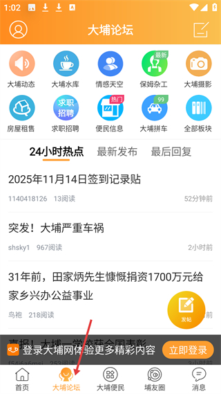 2、大埔論壇頁,含大埔動態、求職招聘等板塊,有24小時熱點、最新發布分類,用戶可瀏覽資訊和互動發帖。