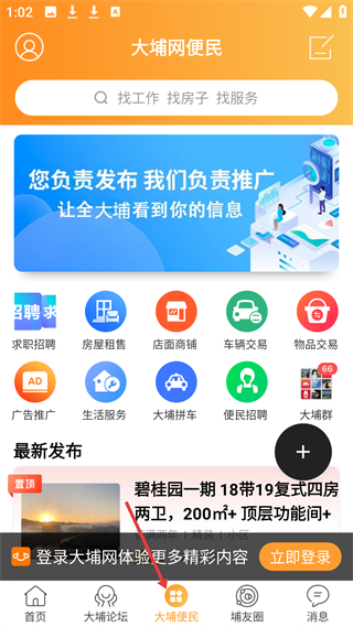 3、大埔便民頁,提供求職招聘、房屋租售等服務分類,還有廣告推廣板塊,展示碧桂園房屋租售等最新發布信息。