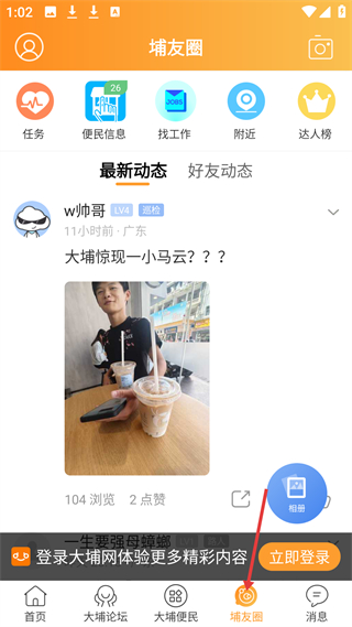 4、埔友圈頁,有任務、便民信息等入口,展示用戶大埔驚現一小馬云動態,用戶可分享生活、互動交流。
