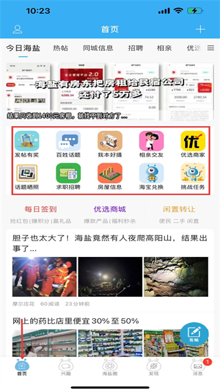 2、用戶打開海鹽網軟件,登錄進入首頁,用戶可在首頁查看今日天氣、熱帖、優選商城、最新發布等。