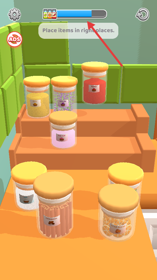 3、整理時要按照提示把物品放到正確位置,屏幕上方有進度條,隨著正確擺放物品,進度條會逐漸填充,需確保物品都放對。