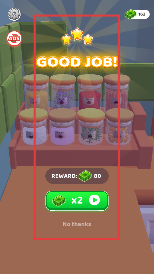 4、成功整理好物品后,會顯示GOOD JOB,獲得星星評價和金幣獎勵,可選擇看廣告雙倍領取獎勵,玩家也可直接領取。