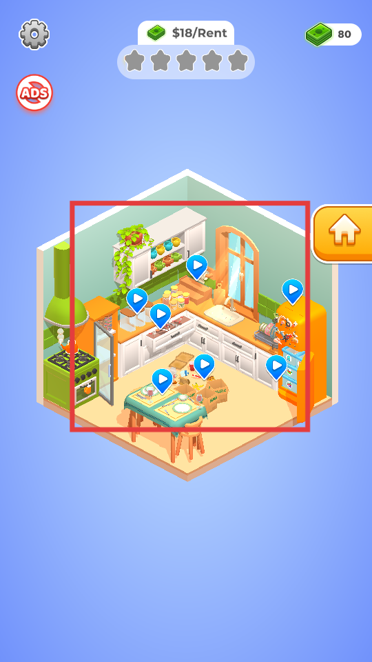 2、進入房間后能看到帶藍色播放標識的物品,這些是需要整理的目標,點擊它們可開始整理操作讓房間更整潔。