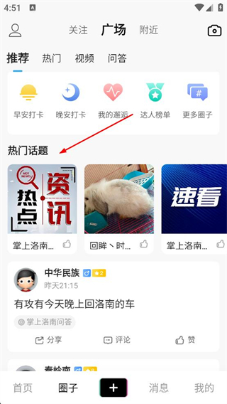2、點擊圈子板塊進入廣場頁面,可查看熱門話題,如掌上洛南熱點資訊、回眸時的寵物等,選擇感興趣的話題點擊進入參與討論。