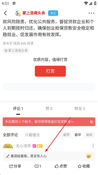 3、在掌上洛南頭條資訊詳情頁可查看資訊內容,參與評論互動,輸入評論內容后點擊發布,分享自己的觀點。