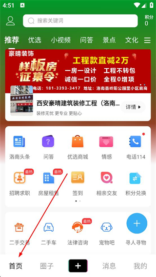 1、進入掌上洛南APP可查看洛南頭條、問答等功能入口,了解豪瑞裝飾樣板房征集等本地商業資訊,點擊相關板塊可進入詳情頁。