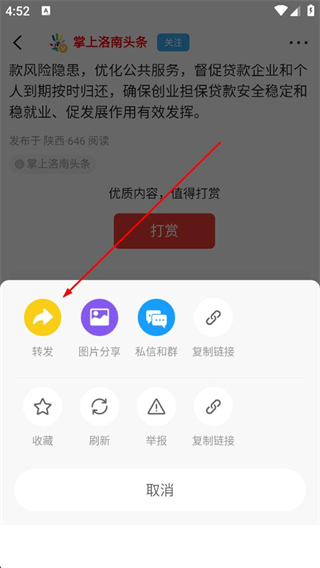 4、點擊轉發功能可選擇轉發、圖片分享等方式,將資訊分享給他人,也可進行收藏。