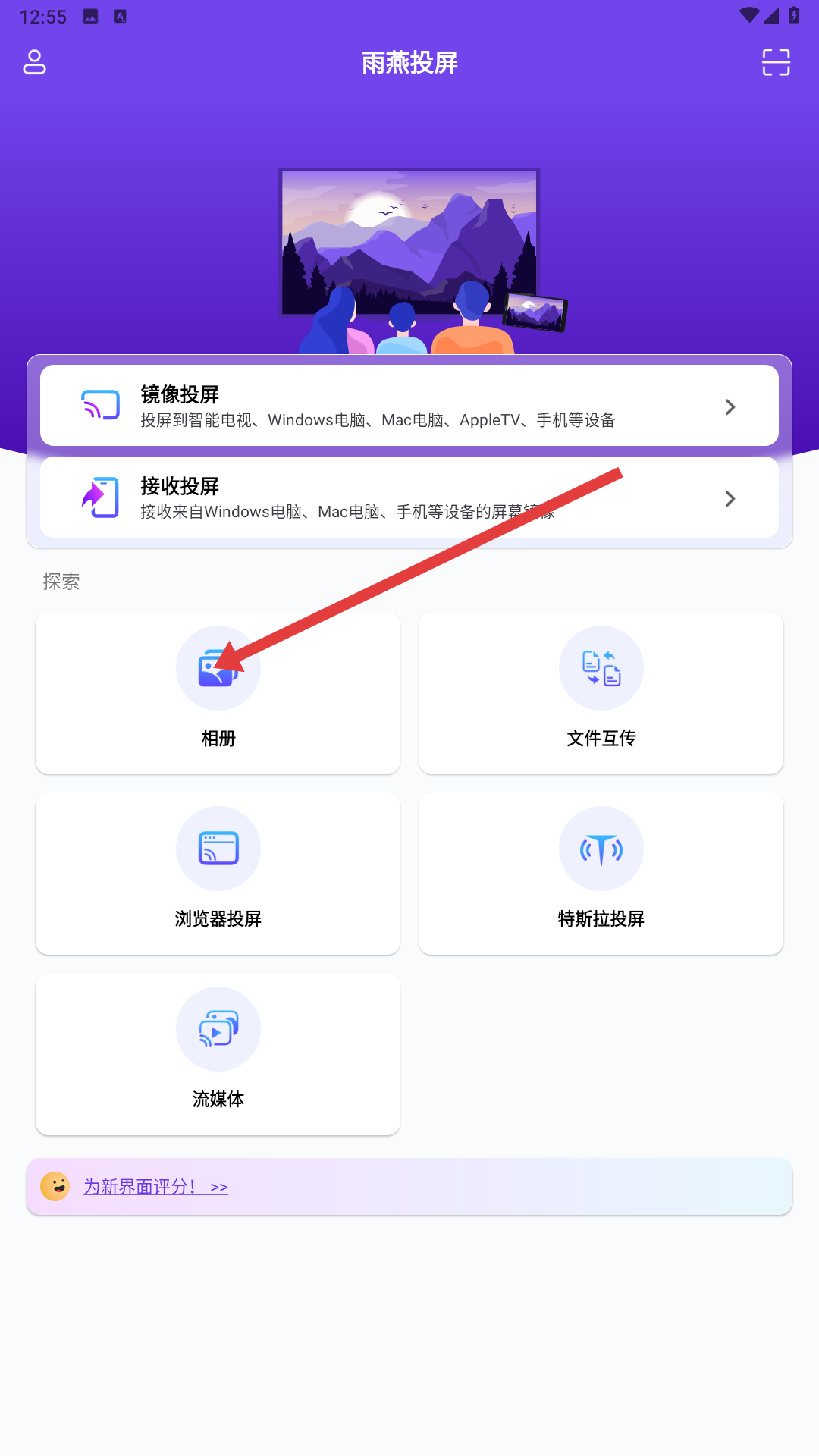 1、進入雨燕投屏首頁,可見鏡像投屏、接收投屏功能入口,還有相冊、文件互傳等探索板塊,可選擇相冊開啟大屏體驗。