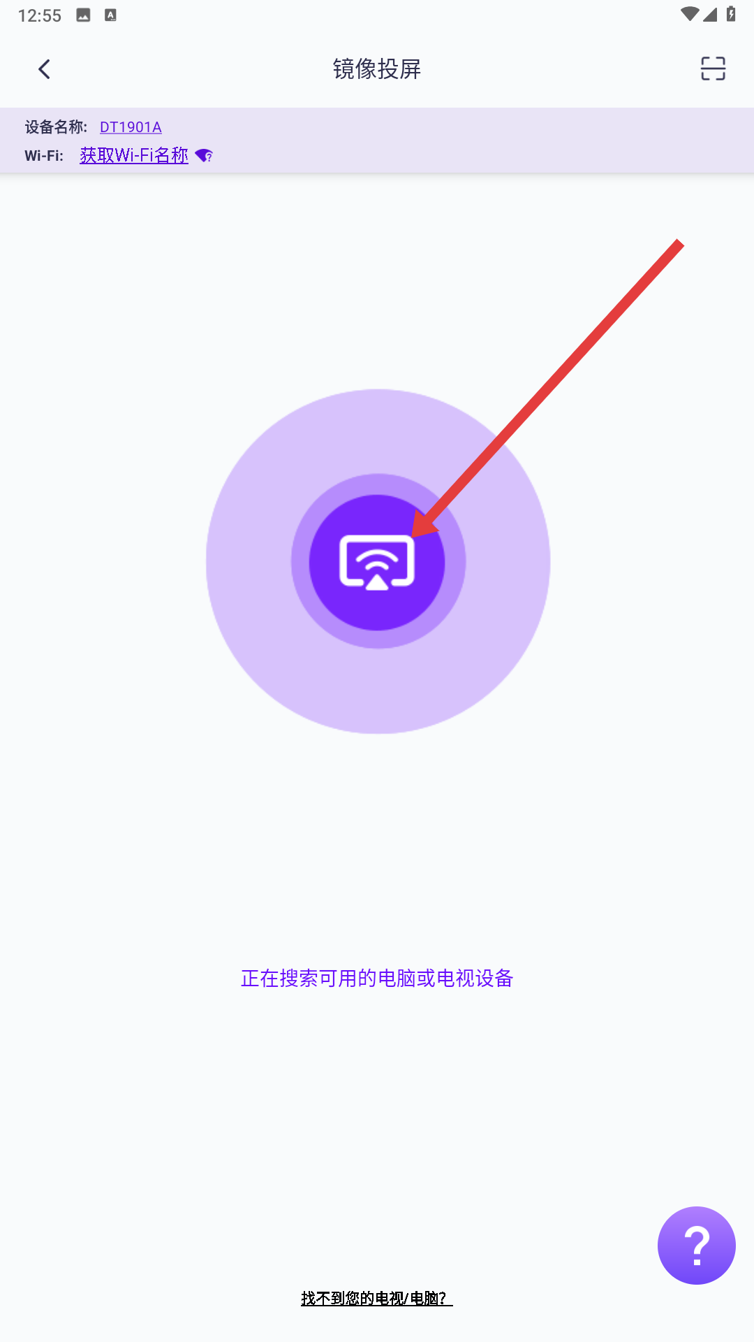 3、進入鏡像投屏界面,設備名稱為DT1901A,會搜索可用的電腦或電視設備,界面中間有投屏圖標,等待設備搜索結果。