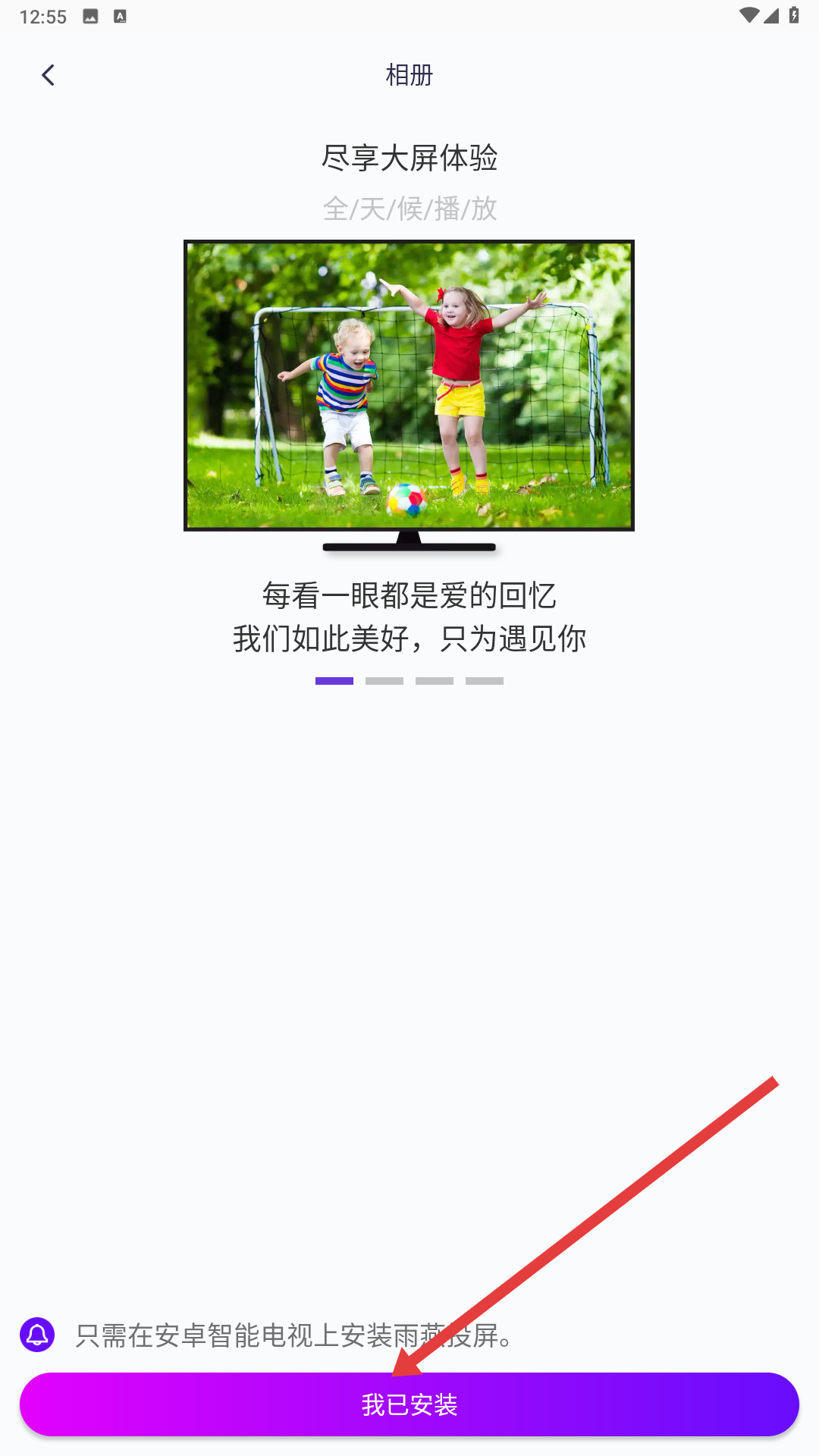 2、點擊相冊后,進入相冊界面,顯示盡享大屏體驗的宣傳內容,需安卓智能電視上安裝雨燕投屏,點擊我已安裝繼續操作。