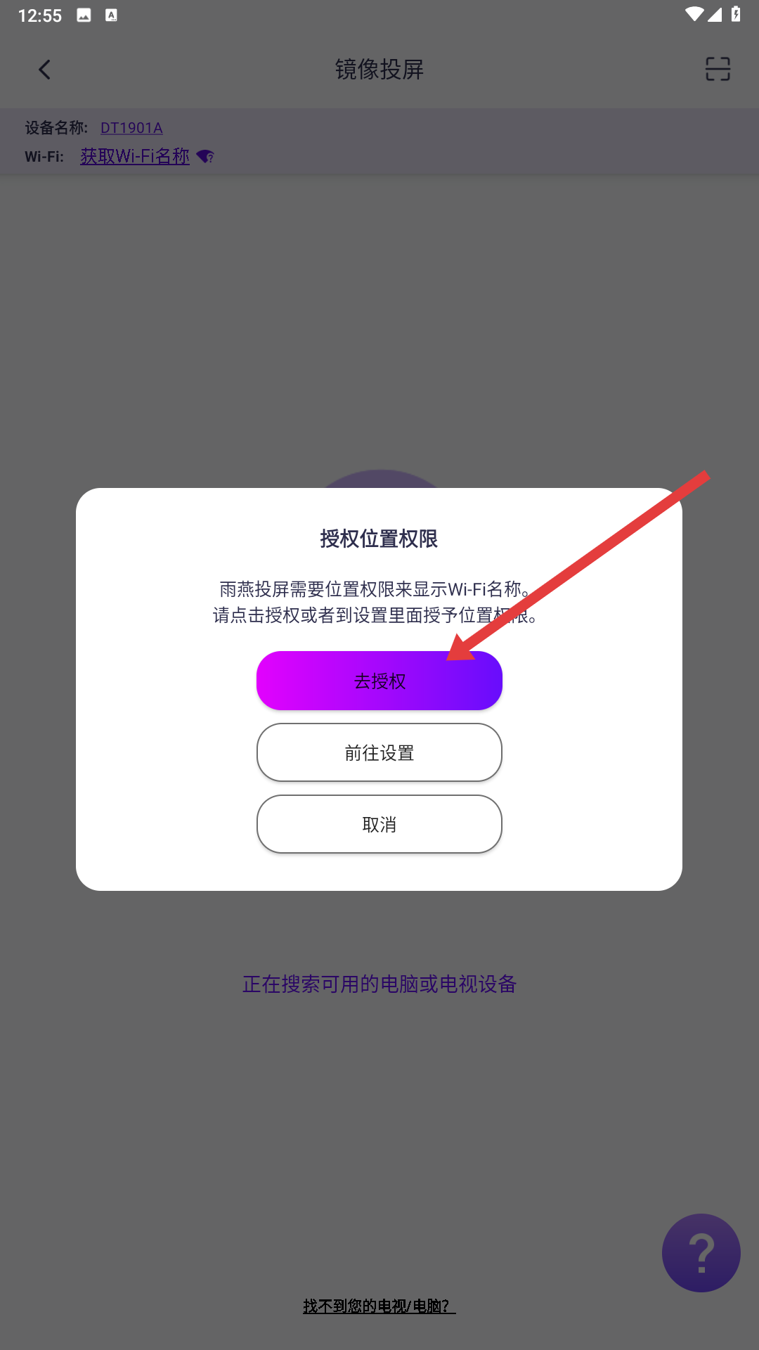 4、若需顯示WiFi名稱,雨燕投屏會請求授權位置權限,可點擊去授權、前往設置或取消,完成授權后可繼續投屏操作。