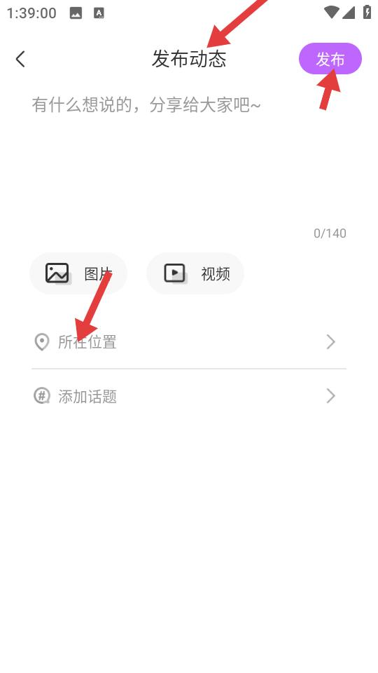 2、發布動態頁面空白輸入框等待用戶分享想法,支持添加圖片視頻豐富內容,還能標注所在位置、關聯話題,簡單操作助力用戶傳遞生活點滴。
